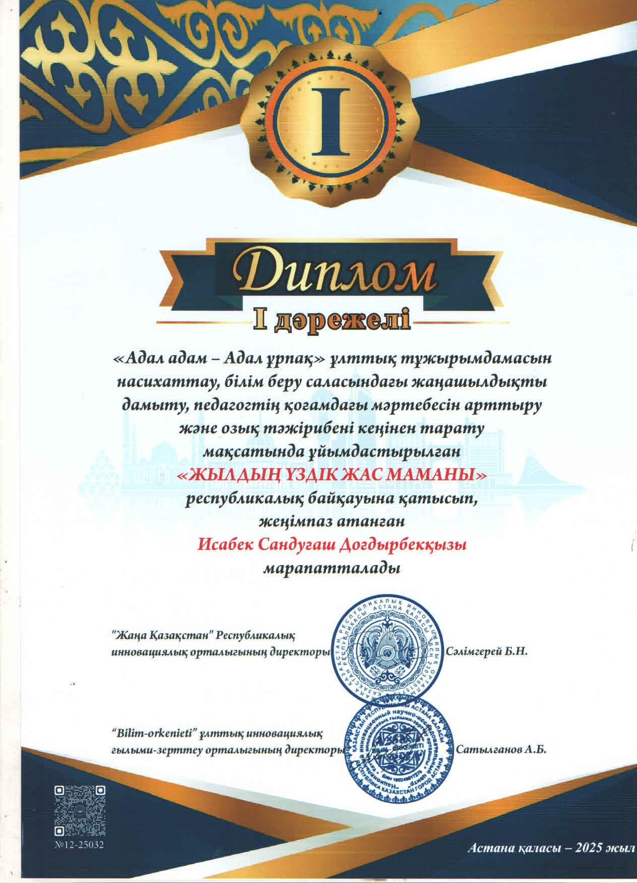 «Жаңа Қазақстан» Республикалық инновациялық, «Білім өркениет» ұлттық инновациялық ғылыми-зерттеу орталығының ұйымдастырған «Жылдың үздік жас маманы» республиалық байқауында балабақша психологы Исабек С.Д. І дәрежелі дипломмен марапатталды.